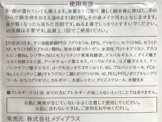 確かに、汚れを落とし最終的には洗い流すとはいえ、多くのメイク落としや洗顔料には肌につけたくない成分も多く配合されています。メディプラスクレンジグングゲルは、防腐剤のパラベンやフェノキシエタノールも不使用ですし、アレルギーテスト済みなので安心して使えました。
