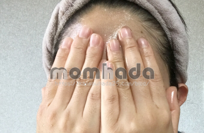 仕事用のバッチリメイクをした日に試してみたのですが、ゲルを顔にくるくるして3秒手のひらで包むだけでメイクがつるんと落ちました。一応ウォータープルーフのマスカラだったのですが、そこまでウォータープルーフが強くなかったせいか、クレンジングゲルだけでちゃんと落ちました。